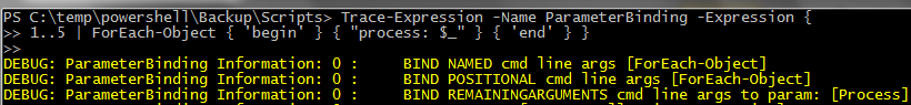 … works and why both –Begin and –End parameters are positional. PowerShell help will tell you that this is not the case. If you use Trace-Expression, you will soon find out that documentation is right, but is not precise in describing how cmdlet as a whole works. It misses very important piece: parameter –Process will take ValueFromRemainingArguments (same way $args does in functions without param block) and if there are more than one – it will try to distribute them between begin, process and end block. First part can be easy traced: