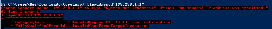 Notice that the AddressFamily property differs between an IPV4 and an IPV6 address. So, what happens if we supply an invalid address?