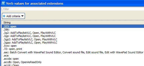 We used PowerShell’s format operator (-f) to have output formatted like: ext: Verb1, Verb2, … Now we can remove Select-Object and send all data to the Out-GridView: