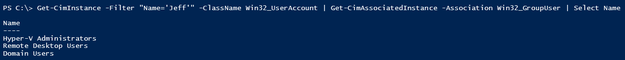 Get-CimInstance -Filter "Name='Jeff'" -ClassName Win32_UserAccount |