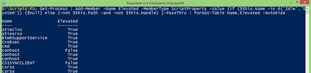 Add-Member -Name Elevated -MemberType ScriptProperty -Value {if ($this.Name -in @('Idle','System')) {$null} else {-not $this.Path -and -not $this.Handle} } -PassThru |