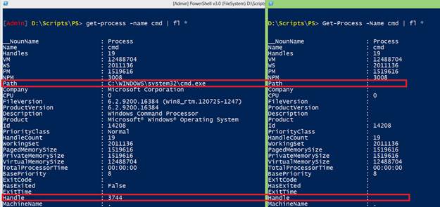 Here we filter on all processes except the “Idle” and “System” processes and we check if we see the Path and Handle properties and finally use the Add-Member cmdlet to add a custom property (Name) to an instance of the Windows PowerShell object.