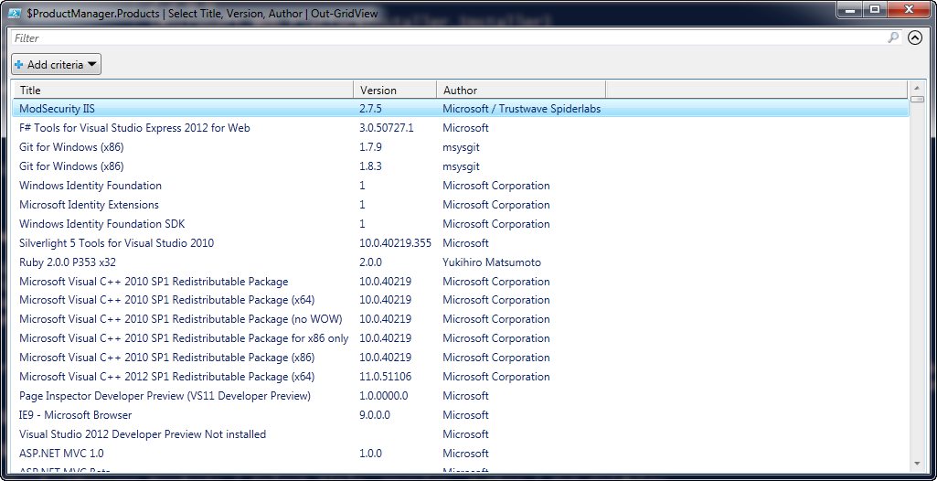 $ProductManager.Products | Select Title, Version, Author | Out-GridView