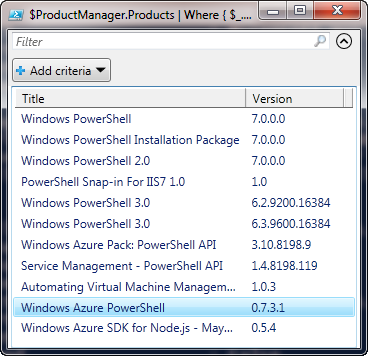 $ProductManager.Products | Where-Object { $_.ProductId -like "*PowerShell*" } | Select Title, Version | Out-GridView