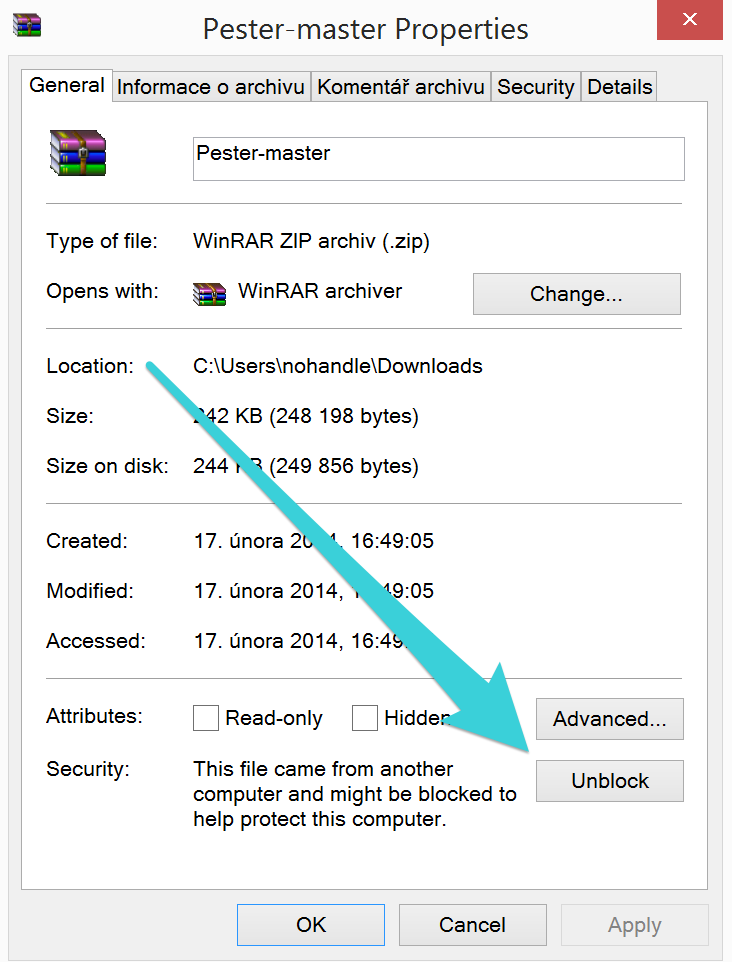 If you are using an older version of PowerShell you will have to unblock the file manually. Go to your Downloads folder and right-click Pester-master.zip. On the general tab click Unblock and then click OK to close the dialog.