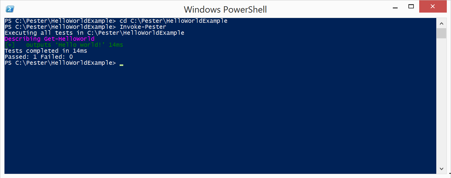 Now it is time to run the test and see if it passes. To do so, you will use another Pester function called Invoke-Pester. By default,Invoke-Pester runs all the tests in all the files in the current directory and its sub-