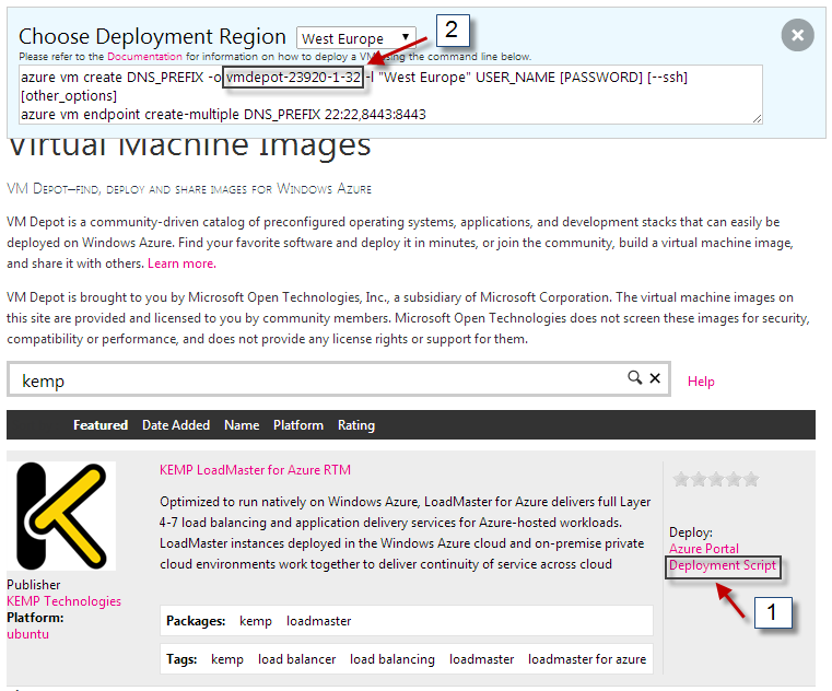 VM Depot is a community-driven catalog of open source virtual machine images. Azure management portal can be used to copy these VM images into “My images” of your Azure subscription. Once we have the community image in “My images”, we can create a VM from that. This is a multi-step process. There is no PowerShell equivalent of doing this. We can, however, use Azure CLI to achieve this in a single command. I will show you how this can be done using PowerShell. For this example, I will deploy Kemp’s Virtual LoadMaster from VM Depot.