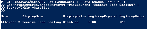 Get-NetAdapter | Where Status -eq "Up" | Get-NetAdapterAdvancedProperty -DisplayName "Receive Side Scaling" | Format-Table -AutoSize