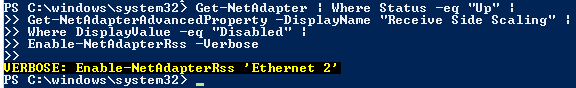 Get-NetAdapter | Where Status -eq "Up" | Get-NetAdapterAdvancedProperty -DisplayName "Receive Side Scaling" | Where DisplayValue -eq "Disabled" | Enable-NetAdapterRss -Verbose