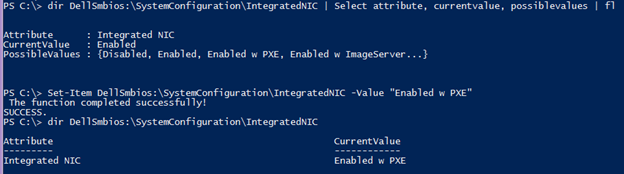 #Enable PXE boot Set-Item -Path Dellsmbios:\SystemConfiguration\"Integrated NIC" -Value "Enabled w PXE"