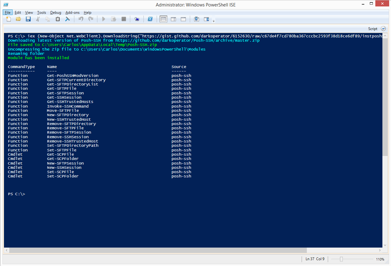 This will download the latest version of Posh-SSH and install it in the user’s profile. Once it finishes downloading and copying the module to the right place, it will list the commands available: