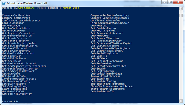 PoshSec from its inception has provided several areas of coverage for managing, auditing, and baselining systems. Originally, PoshSec focused on the CSIS Top 20 controls and provided features that lined up with the various quick win items that the Top 20 list. The Top 20 list can be found at http://csis.org/publication/twenty-important-controls-effective-cyber-defense-and-fisma-compliance. PoshSec has grown since that time and cover areas including forensics and network base lining as well. Currently there are 63 cmdlets/functions in the PoshSec module. We provide coverage for the following areas: