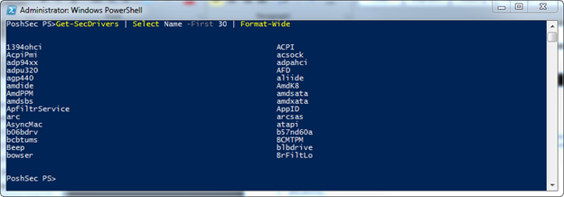 As any good system administrator or analyst can tell you, knowing what is installed on your systems is vital. One of the features we provide is to display the current drivers that are installed on the system. The big win here that we give is the ability to baseline the system to see if anything has changed. The Get-SecDrivers cmdlet allows you to export a CLIXML file with nothing more than specifying the –Baseline switch on the end of the parameter. Below is a screenshot of Get-SecDrivers.