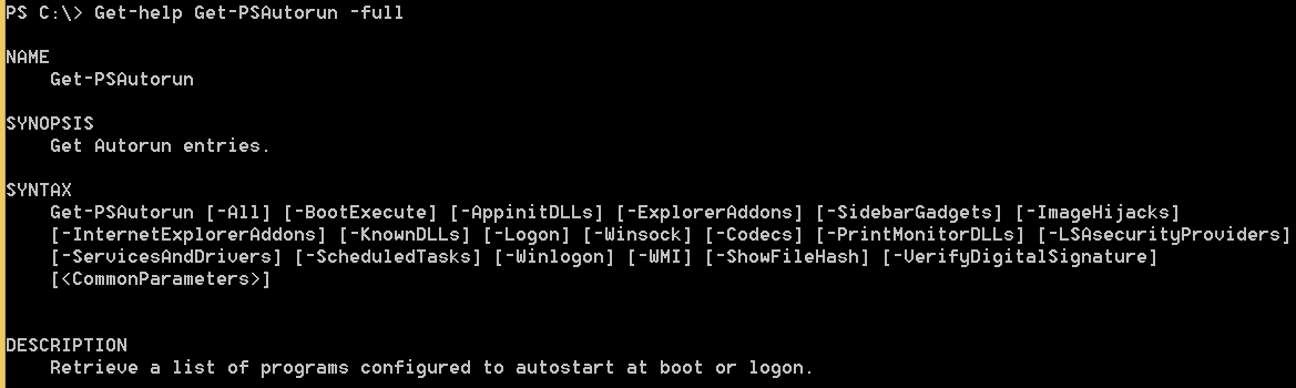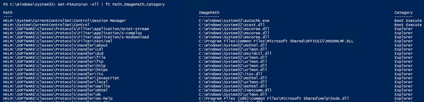 Get-PSAutoRun uses the same categories as autoruns.exe: Logon, Explorer Add-ons, Scheduled Tasks, Services, Drivers, Codecs, LSA Providers,… just to name a few.