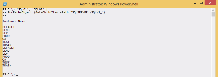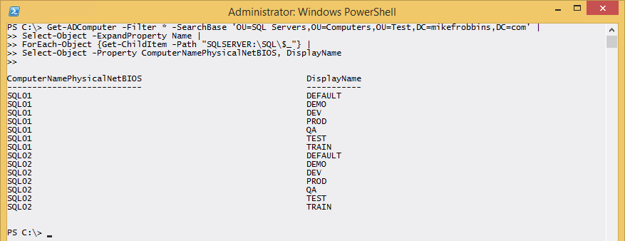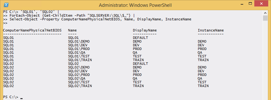 ‘SQL01’, ‘SQL02’ | ForEach-Object {Get-ChildItem -Path “SQLSERVER:\SQL$_”} | Select-Object -Property ComputerNamePhysicalNetBIOS, Name, DisplayName, InstanceName