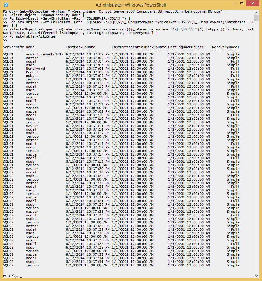 You could also return information such as when the latest backups were taken and what the recovery model is for every database on every instance of every SQL Server all with a PowerShell one-liner: