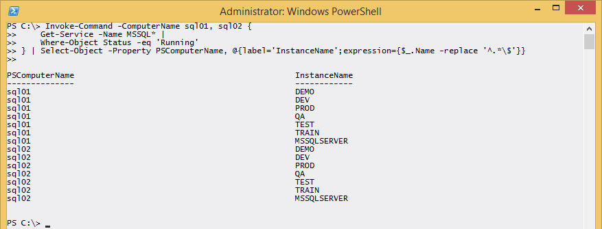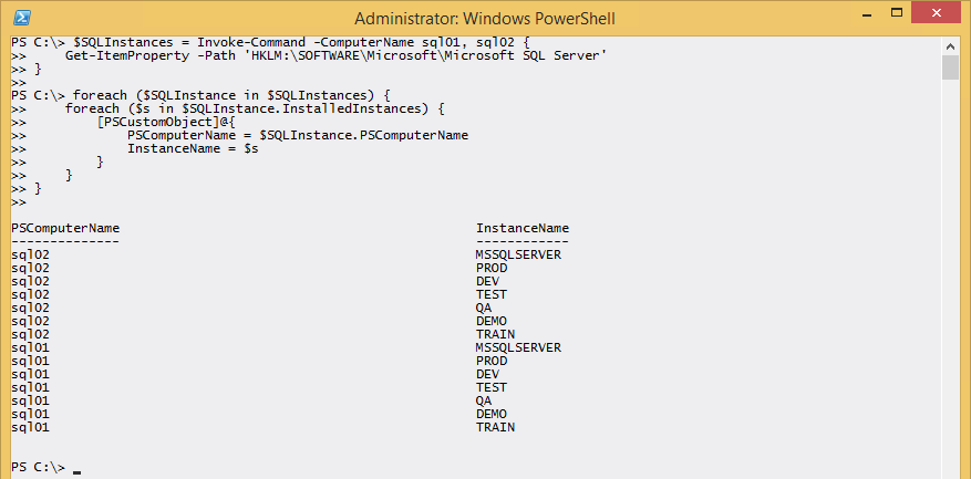 $SQLInstances = Invoke-Command -ComputerName sql01, sql02 {