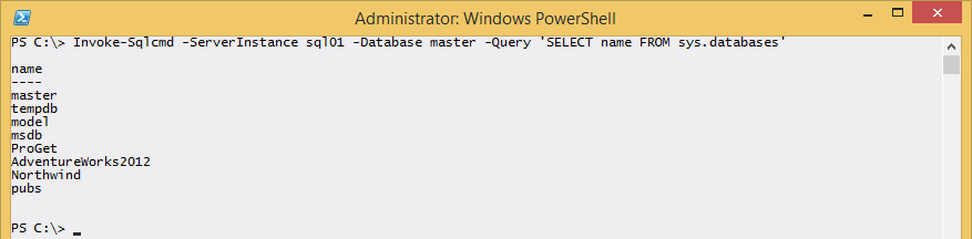 Invoke-Sqlcmd -ServerInstance sql01 -Database master -Query ‘SELECT name FROM sys.databases’