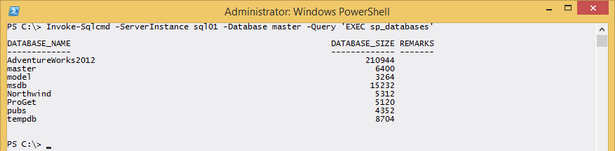 Invoke-Sqlcmd -ServerInstance sql01 -Database master -Query 'EXEC sp_databases'