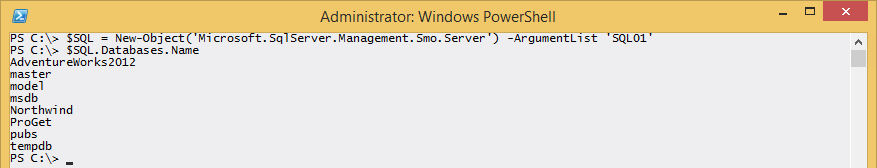 In this example, I’ll use SMO to return a list of database names for the default instance of SQL Server on sql01: