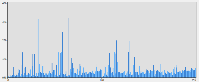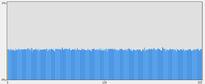 How can we tell how “random” something is? It’s actually fairly easy to visualize by looking at a histogram of the frequency of which each byte in a sequence occurs. For example, here’s a frequency diagram of an uncompressed kernel32.dll vs. a frequency diagram of kernel32.dll as a compressed and encrypted zip file.