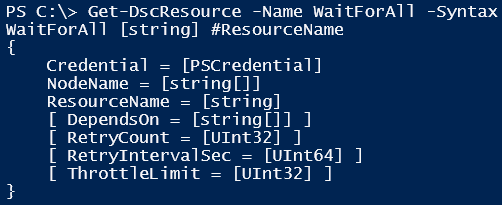 Looking at the syntax for the WaitForAll resource, we understand that the NodeName, ResourceName, and Credential are the mandatory properties. The NodeName property is used to specify the name of the remote system on the which the dependent resource should be configured. The ResourceName property is used to specify a list of resources that should be configured.