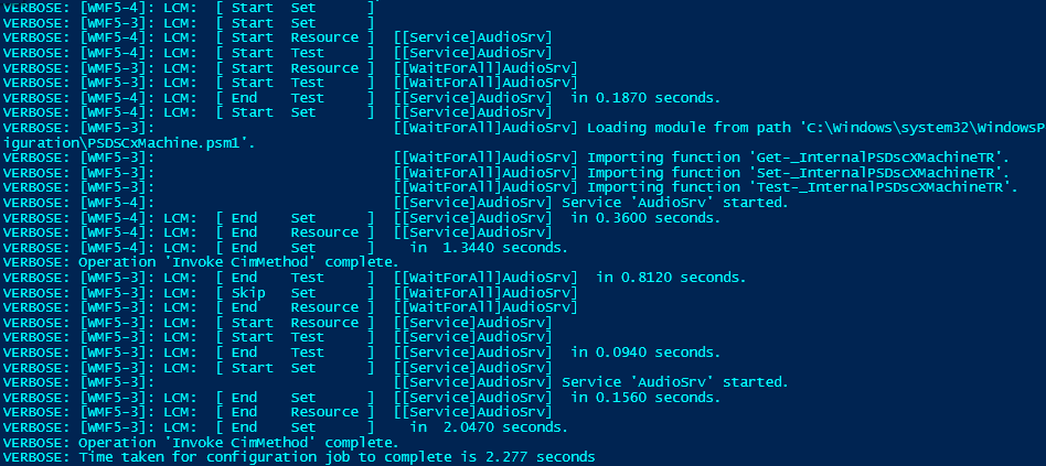 This is a simple configuration script where we defined that the configuration on node WMF5-3 depends on the AudioSrv configuration on node WMF5-4. This is defined using the WaitForAll resource. Also, observe that we are passing plain-text credentials by specifying PsDscAllowPlainTextPassword property in the DSC configuration data. This is not the best practice but just a quick hack for this demo.