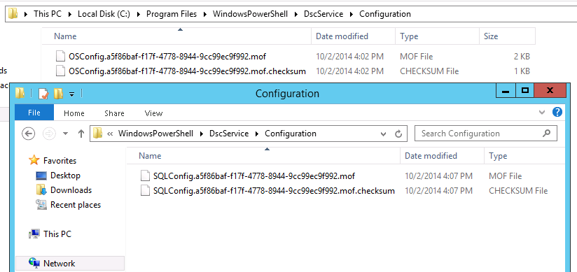 With the above configuration fragment scripts, we have also generated the MOF and the checksum files. These files are generated in the form of GUID.mof and _GUID.mof.checksum _where GUID is the value of LCM ConfigurationID property on the target system. While this works with normal pull server configuration, we need something more with partial configurations. We need to prefix these files with the configuration name mentioned in the LCM PartialConfigurations property. So, in my demo, this is how it looks.