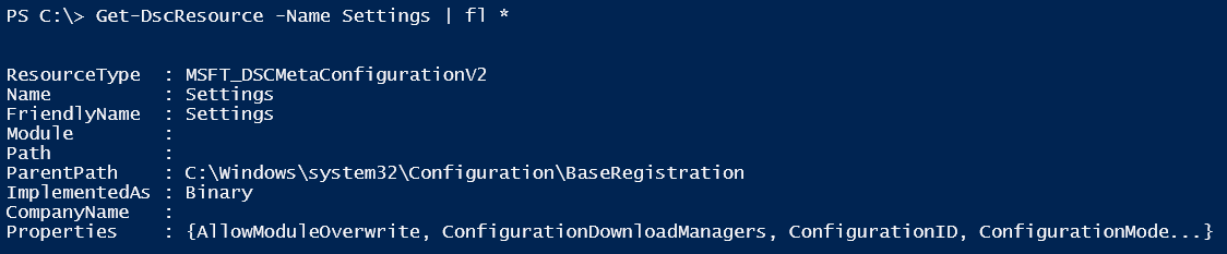 The first thing you notice here is the new attribute called DSCLocalConfigurationManager(). This identifies the configuration script as the meta-configuration. When using this attribute, the LCM settings need to be placed in the Settings class. This resource is represented by the MSFT_DSCMetaConfigurationV2 class whereas the MSFT_DSCLocalConfigurationManager class represents the LCM settings in earlier release of DSC. This class is still available and you can use the old style of configuring LCM in WMF 5.0 too.