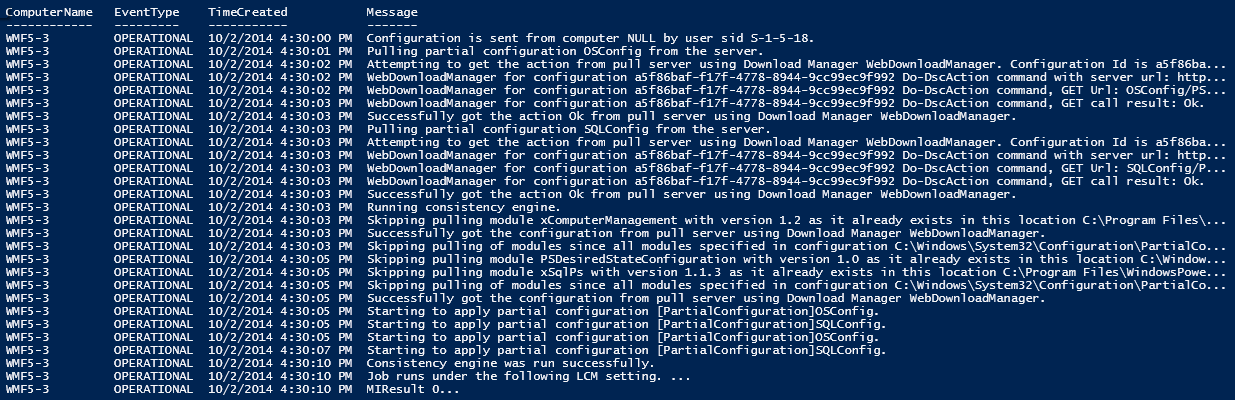Without this prefix, the pull client would not be able to identify and download the partial configurations. Once you have all these ingredients ready, we can either wait for the LCM pull client refresh internal to kick in or manually invoke the configuration check. The latter is what I did. This can be done by calling either PerformRequiredConfigurationChecks CIM method of the LCM or using Update-DscConfiguration cmdlet.