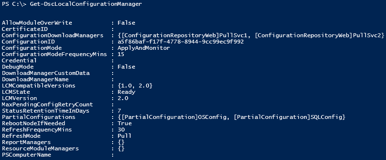 While authoring the partial configurations, the configuration name must match the identifier associated with the partial configurations defined in the LCM. In the above example, the configurations should be named OSConfig and SQLConfig. Once we have the meta-configuration created, we can run the script to generate the meta-configuration MOF. This can be enacted using the Set-DscLocalConfigurationManager cmdlet. Here is how the LCM configuration looks after I updated the meta-configuration.
