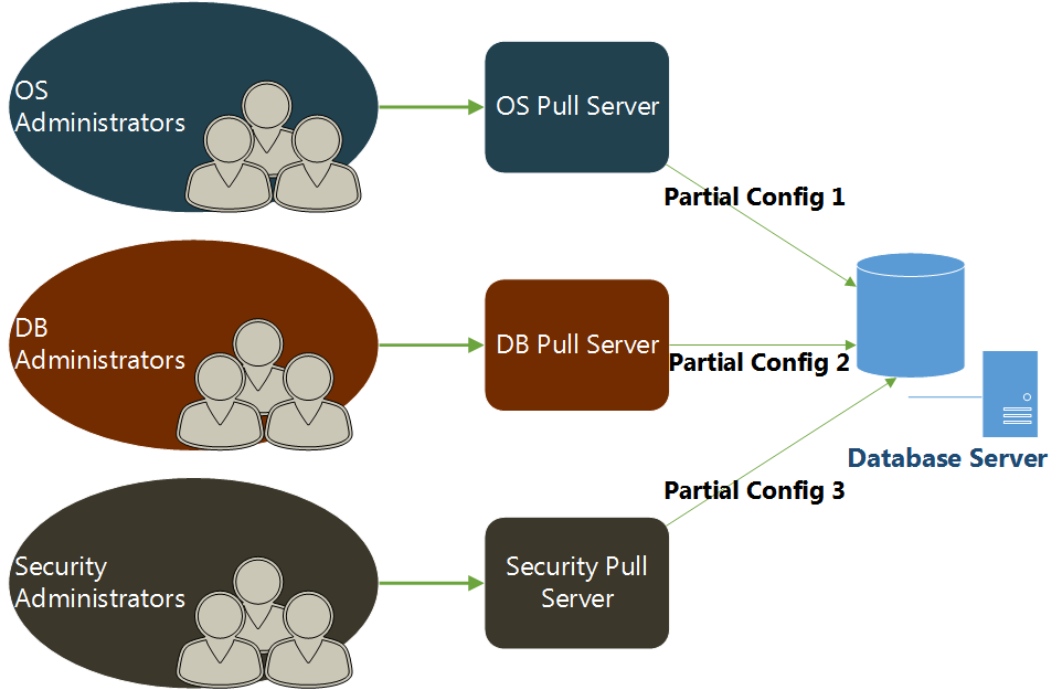 While incremental configurations and ability to deliver fragments of configuration is important, the real benefit of partial configurations is in enabling delegated control and ownership. In a real world, the OS deployment and base OS configuration is done by folks or teams different from the people who install, configure, and manage SQL instances. Similar to these teams, there may be a security team that takes care of OS and application hardening configuration. With the earlier release, all these teams had to update the same configuration script. While collaboration is good, there is a huge room for errors. This can be solved effectively using partial configurations. Every team owns its configuration and manages it independent of others. In fact, with partial configurations, it is possible for these different teams even have their own pull server for delivering configurations to the target systems. Having multiple pull servers to deliver partial configurations is optional.