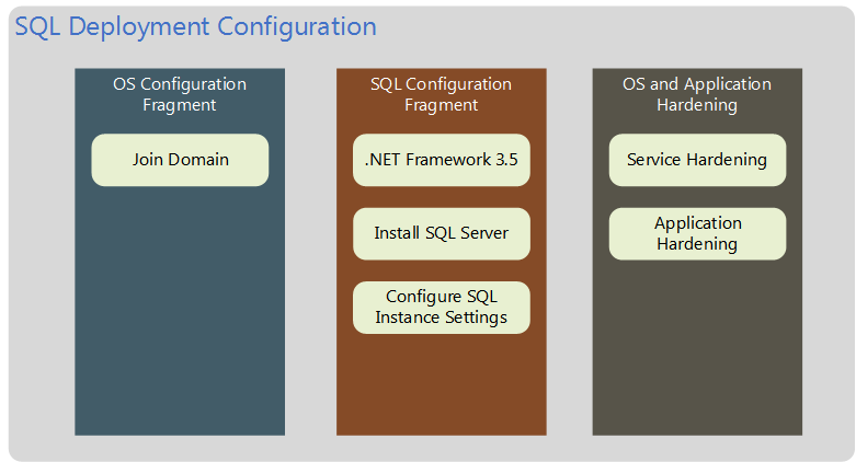 Imagine we are deploying a SQL Server. Assume that we have already installed OS and we are using DSC to perform the post-OS deployment tasks. The first thing we’d need to do is make the target system a part of AD domain. Within the SQL configuration, we need to install .NET Framework 3.5 and invoke the SQL deployment, and complete SQL instance configuration. Optionally, OS and application service hardening might be required based on IT policies.
