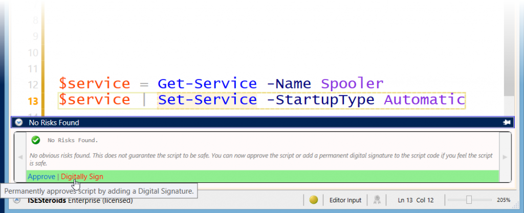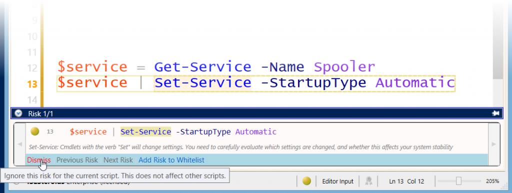 When you hover over the icon, a tooltip appears and tells you why ISESteroids thinks there is a risk, and what you can do about it. For example, in the screen shot, the sample code contained the cmdlet “Set-Service”, and the tooltip declares this risk as a “Minor Risk” and states: “Cmdlets with the verb ‘Set’ will change settings. You need to carefully evaluate which settings are changed, and whether this affects your system stability”. Likewise, ISESteroids displays other detailed instructions for other cmdlets identified as potential risk.