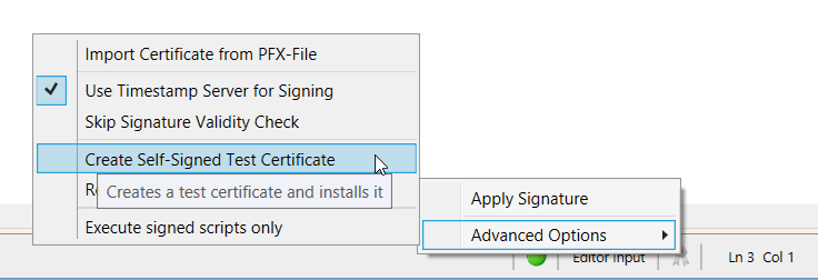 - You can easily create your own self-signed code-signing certificates. Simply click the signature icon in the ISESteroids status bar, and choose Advanced Options/Create Self-Signed Test Certificate