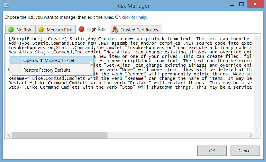 Or, the user decides that this risk is really never a problem in his or her environment. So if the user wants to treat “Set-Service” as always safe, he or she would click “Add Risk to Whitelist”. This puts the particular risk on the personal white list. This type of risk will then be excluded from future risk checks.