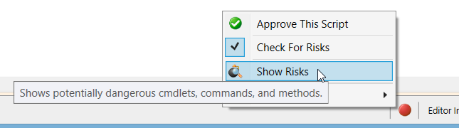 Once ISESteroids displays a yellow or red icon, it is time to review the risks. To review and assess all potential risks in a script, the user would now click the risk icon. This opens a context menu with additional options. To start the review, choose “Show Risks”.