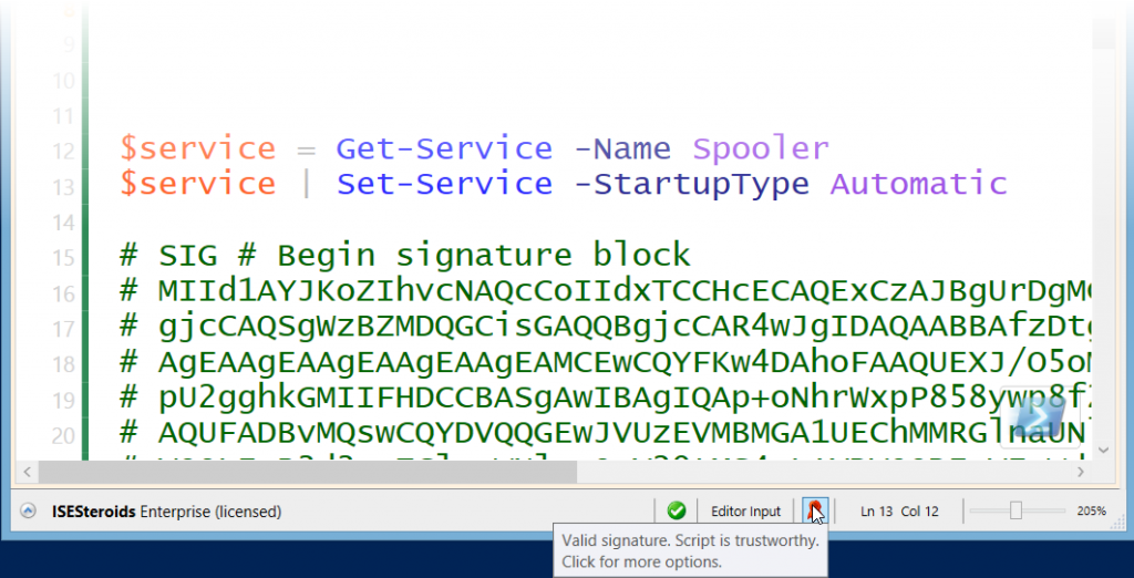 - You can easily verify script integrity. When you load a script that carries a digital signature, the signing icon in the ISESteroids status bar will display an icon indicating whether the signature is trustworthy, and whether the script has changed since. You can hover over the icon to learn more.