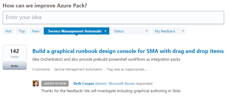 There are also other feedback channels available for PowerShell-related technologies such as Azure Automation and Service Management Automation (SMA). Microsoft Azure is using UserVoice, a software-as-a-service provider of customer support tools. Here is a few categories from the Azure channel at UserVoice relevant to PowerShell: