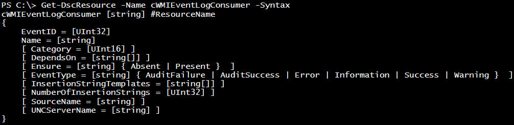 The WMI Event Log Consumer DSC resource has only two mandatory properties. The Name property uniquely identifies the consumer instance and the EventID is the numerical ID assigned to identify the event log entry. However, it does not make sense to log an event entry without the message text and event source and so on. The other properties of this DSC resource provide a way to specify this.