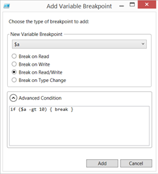 In addition, a right-click opens the debug menu which allows you to set advanced breakpoints. Simply choose “Breakpoints/Add Variable Breakpoint”. This opens a dialog, and you can choose which variable to monitor. Optionally, you can expand the “Advanced Condition” Setting, and enter a PowerShell condition that must be met for the breakpoint to break.