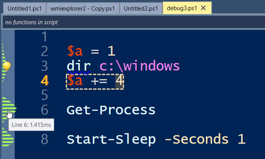 The debugger margin will now show a real-time graph indicating how much time each script line took to execute. In the menu “Profiling”, you can also change what the graph shows and how it scales. By default, the profiler monitors performance. You can switch it to “Frequency”, too. Now, the graph shows how often each line of a script gets executed.