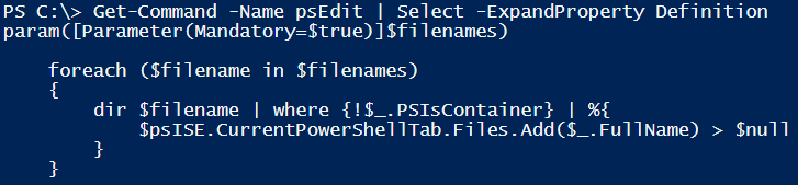 If you are wondering, what is psEdit, it existed in Windows PowerShell for a long time (since 2.0) and is used to add the specified file(s) to the current PowerShell tab in PowerShell ISE.