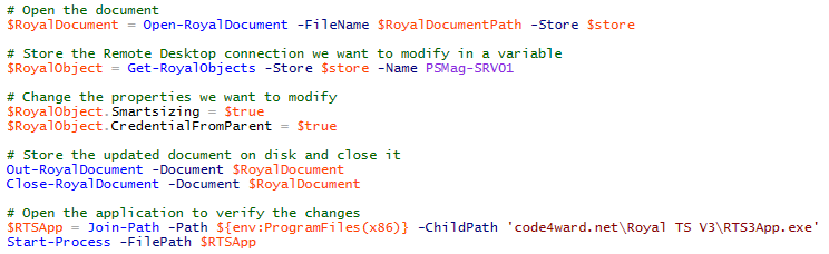 _ The purpose of this script is to show how the Royal TS PowerShell module available in Royal TS 3.0 beta can be used to manage a Royal TS document. Thus it must be customized to meet specific needs, the script shows how to configure a couple of Remote Desktop connection properties as an example._