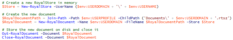 Next step is to create a Royal Document where we can store connections. As described in the Getting Started section of the help file, we first need to create a new RoyalStore in memory before we can use New-RoyalDocument.