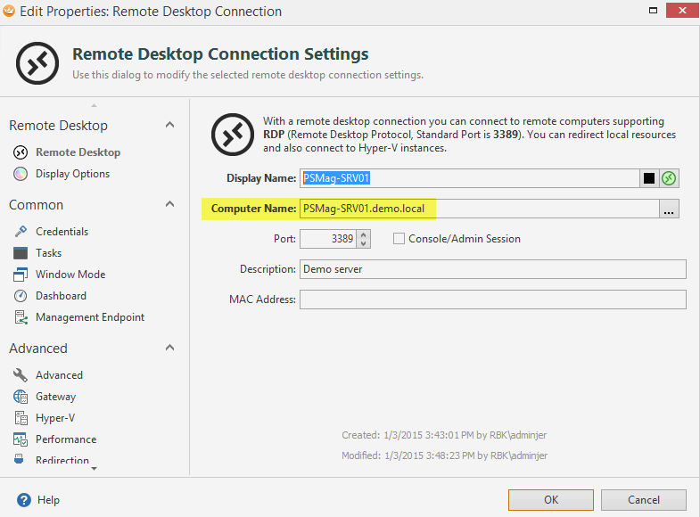 If we right click the Remote Desktop connection we created and go into Properties, we can also see that the Computer Name is configured with the value we supplied as the URI: