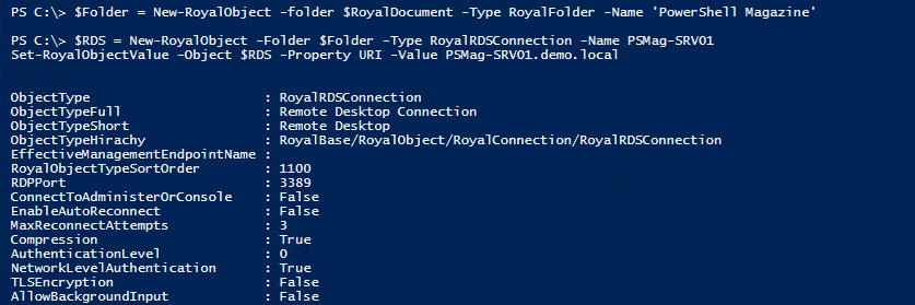 An object of the type RoyalRDSConnection is returned when we call the New-RoyalObject and the Set-RoyalObjectValue cmdlets.