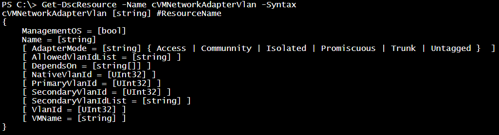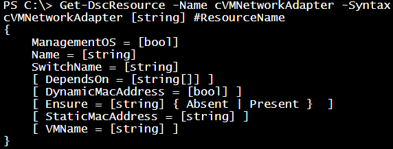 There are three mandatory properties similar to the cVMNetworkAdapter DSC resource. You must specify the Name, SwitchName, and ManagementOS properties.