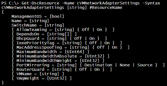 If you have not downloaded the new DSC resource modules yet, you can do so from my Github repo or using the Install-Module cmdlet in WMF 5.0. To create a converged virtual switch, we will need the cVMNetworkAdapter resource from the cHyper-V module. The cVMNetworkAdapter can be used to create VM network adapters either in the management OS or connect network adapters to VMs.