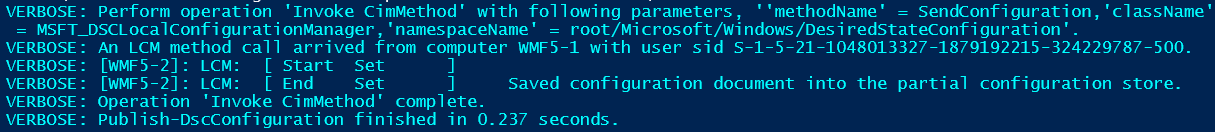 When this step is complete, the published configuration can be enacted by specifying the -UseExisting switch parameter with the Start-DscConfiguration cmdlet.
